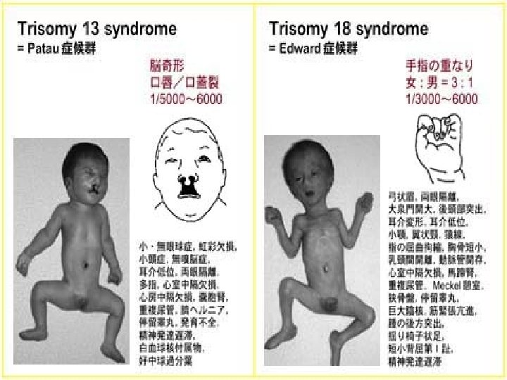 15. Sindromul trisomiei 13 (Patau) Sindromul trisomiei 13 afecteaza unul din 20000 de nounascuti. El duce la aparitia buzei despicate, a degetelor flexate, cu degete suplimentare, a hemangioamelor (malformatii ale vaselor de sange) pe fata si pe gat si la multe anomalii structurale craniului si fetei. Poate provoca si malformatii ale coastelor, inimii, organelor abdominale si ale organelor sexuale. Supravietuirea pe termen lung este putin probabila.