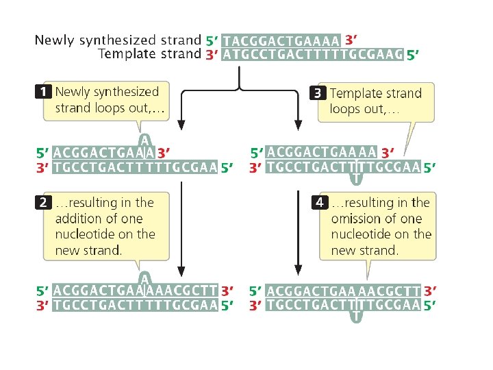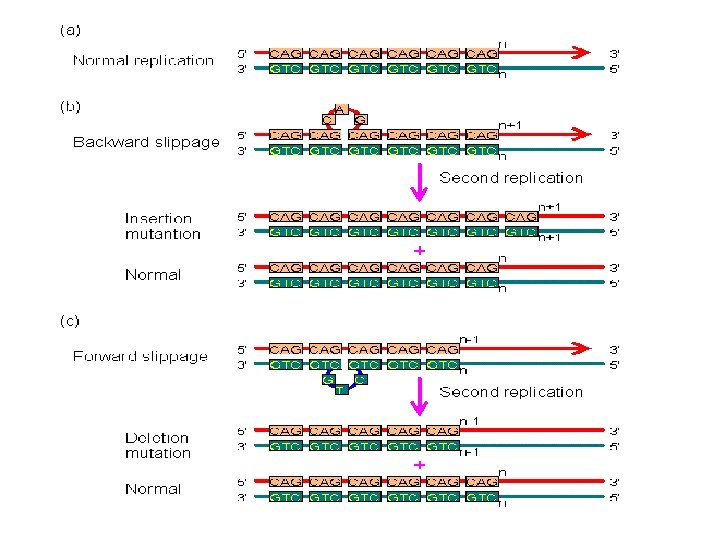 A. Gene Mutation 1. Mutations are Classified in Different Ways: 2. The Rates of Spontaneous Mutations: 3. How Spontaneous Mutations Occur: a. Substitutions: - truly random error in replication - tautomeric shift: (same base, but different pairing) - deamination of A and C cause mispairings - depurination: loss of A or G base in ds-DNA, and random replacement during replication. - oxidative damage b. Frameshifts: - replication slippage - most common where there are repeat sequences (like ‘tandem repeats’ of CGCGCGCGC…). - because errors are common, these are ‘hypermutable’ regions, and we differ at an individual level in the lengths of these sequences… often used for ‘DNA fingerprinting’