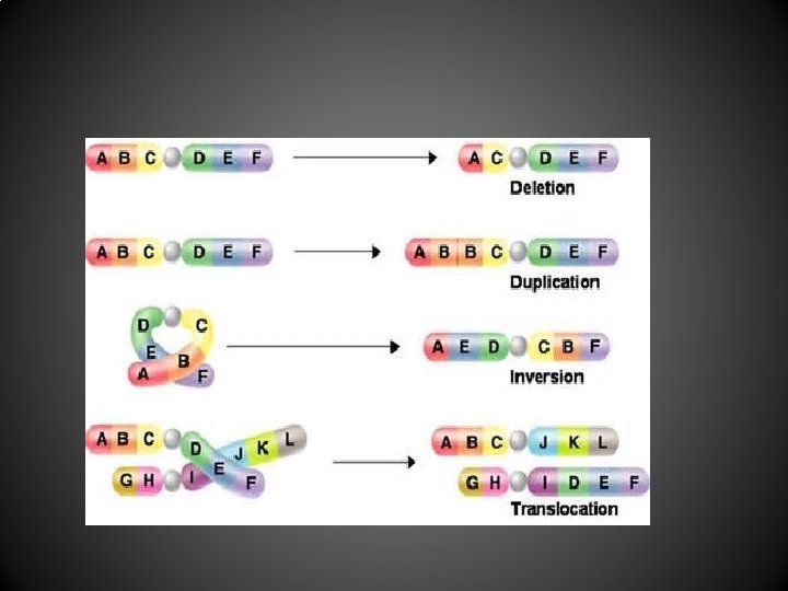 Chromosomal mutations • Involves change in the number or structure of chromosomes : • Types: – Deletions – Duplications – Inversions – Translocations