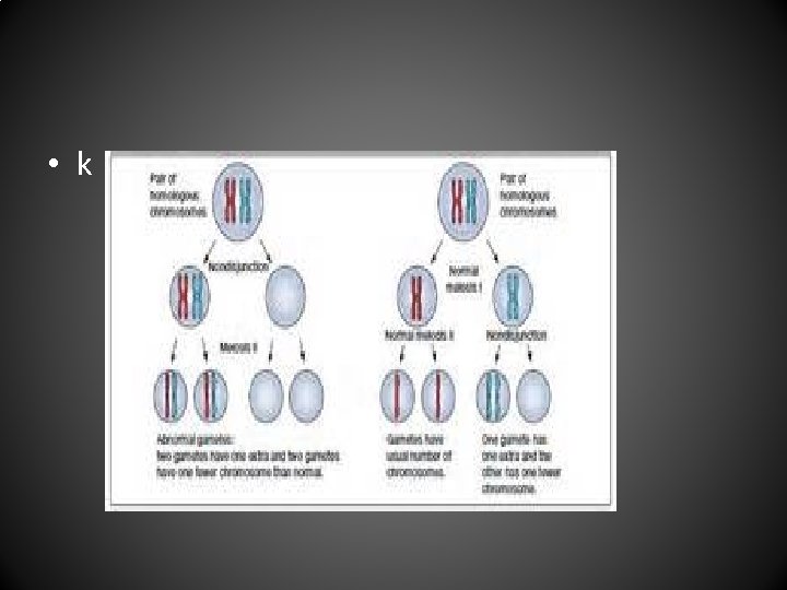 • Too many chromosomes or too few in an egg or sperm result in incorrect chromosome number in new organism…causes death or many disorders: • Example = down syndrome • Extra chromosome of pair 21