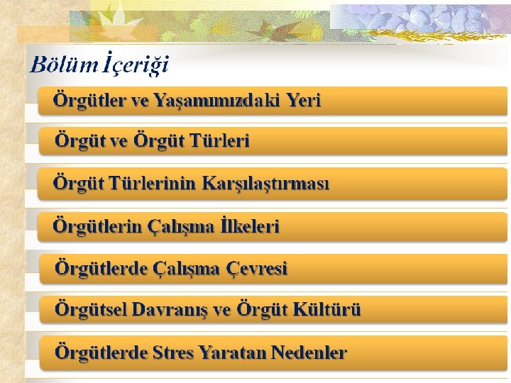 Örgütlerde Çalışma Çevresi n n n n Yönetim yapısı ve yönetim karar sistemleri Yönetici, düzenleyici ve denetleyiciler Örgütsel yapı ve teknoloji İnsan kaynakları Mali kaynaklar Ortak ve hissedarlar Sosyoekonomik çevre ve yapı