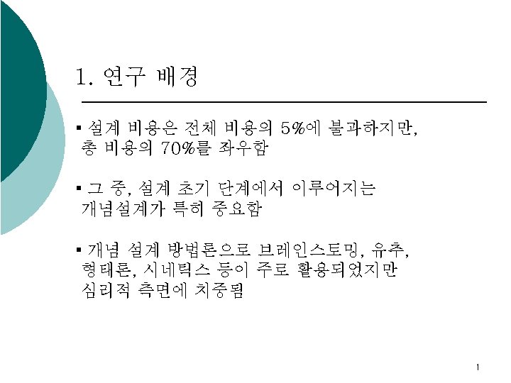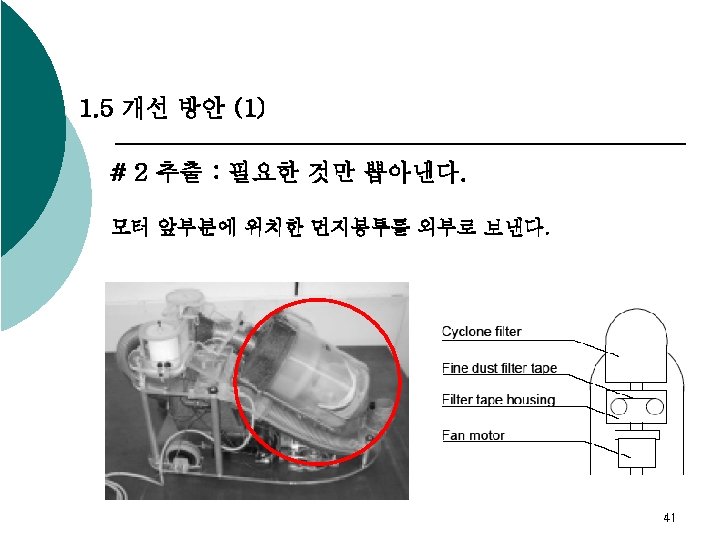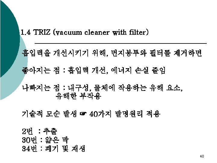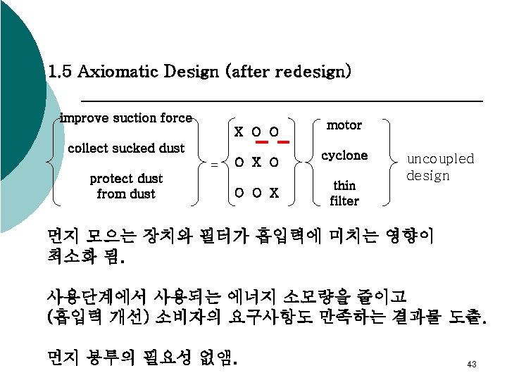 1. 3 Axiomatic Design (vacuum cleaner with filter) improve suction force X X X motor collect sucked dust O X O dust bag O O X filter protect motor from dust = decoupled design 현재 설계를 개선하려면, 먼지 봉투와 필터가 흡입력에 미치는 영향을 최소화시켜야 함. Improve decoupled design to uncoupled design 39