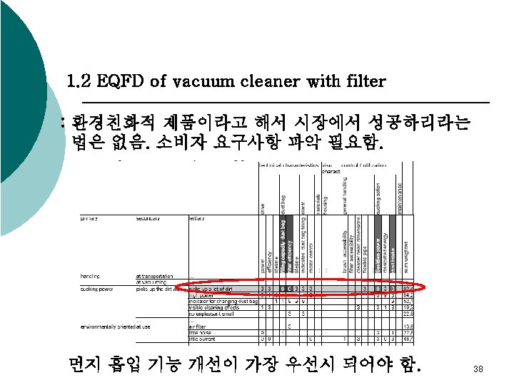 1. Vacuum cleaner (AD with TC) 1. 1 LCA of vacuum cleaner with filter : 환경적으로 가장 취약한 단계 파악 Improve eco-efficiency in product use stage 37