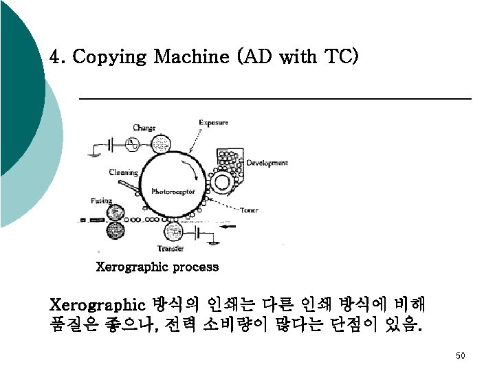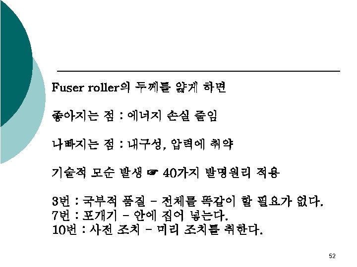 두께가 얇으면 축 변형이 일어남 heat the paper X X O stand upper pressure = O X O stand lower pressure O O X heat lamp thickness (fuser roller) thickness (pressure roller) 51