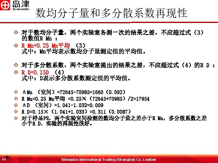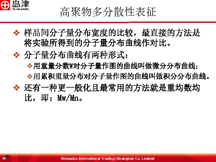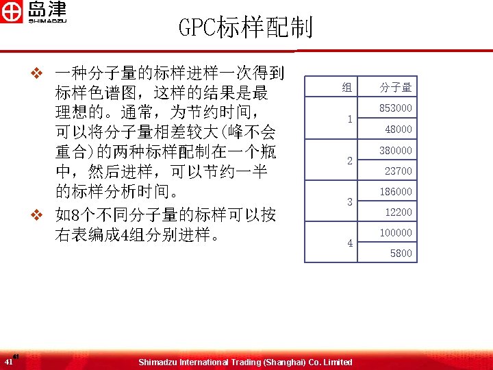 样品分析结果 51 51 Mn Mw Mz Mz 1 Mw/Mn Mz/Mw 43679 73178 101377 125121 1. 67534 1. 38536 Shimadzu International Trading (Shanghai) Co. Limited