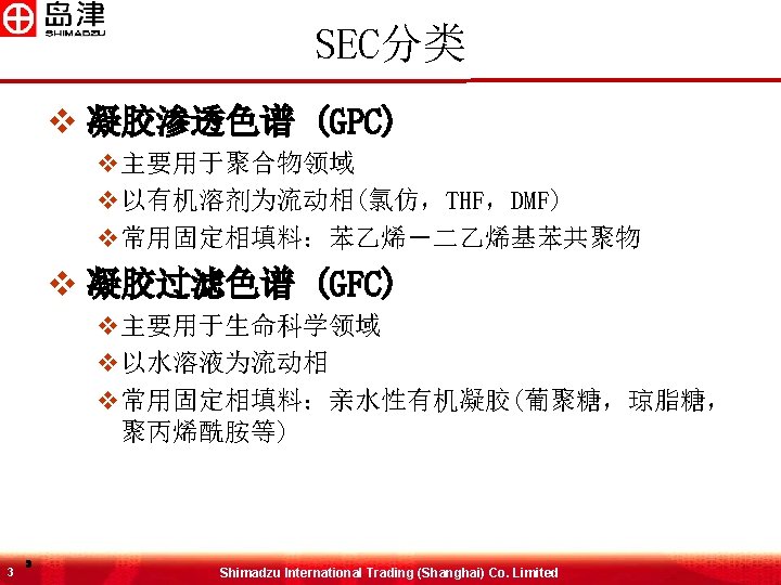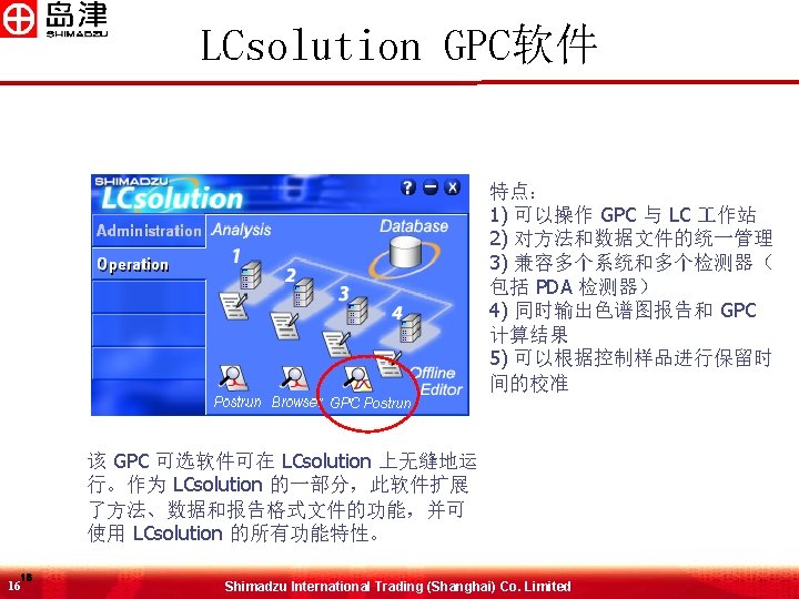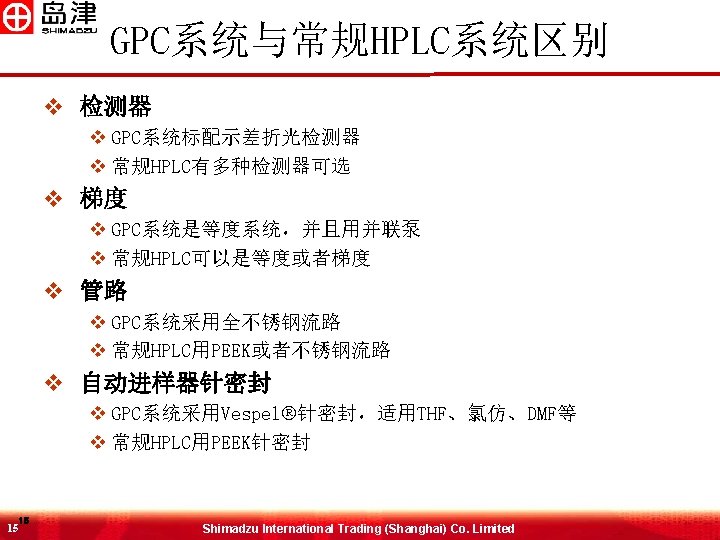 GPC系统配置 �� 器 � THF, � 仿, DMF 色� 柱 柱温箱 示差�� 器 需要GPC软件才可计算MW 13 13 �� 器 Shimadzu International Trading (Shanghai) Co. Limited