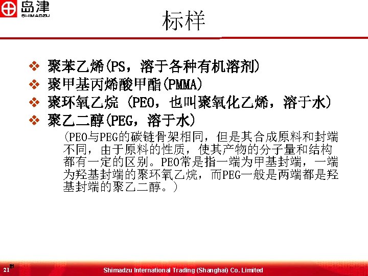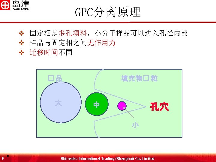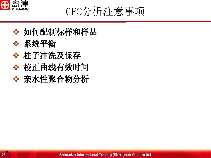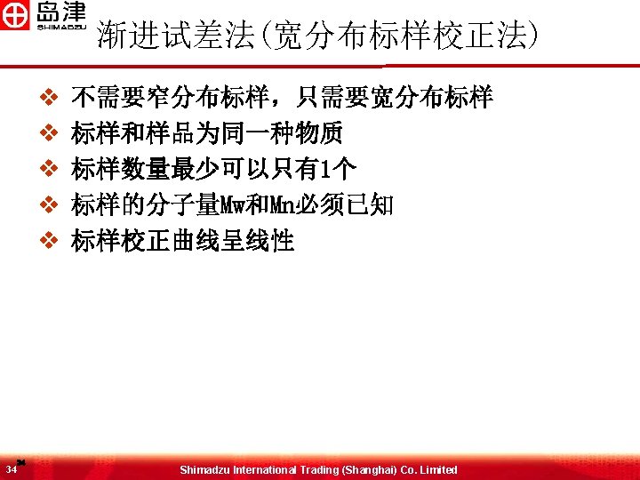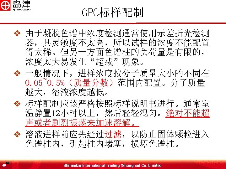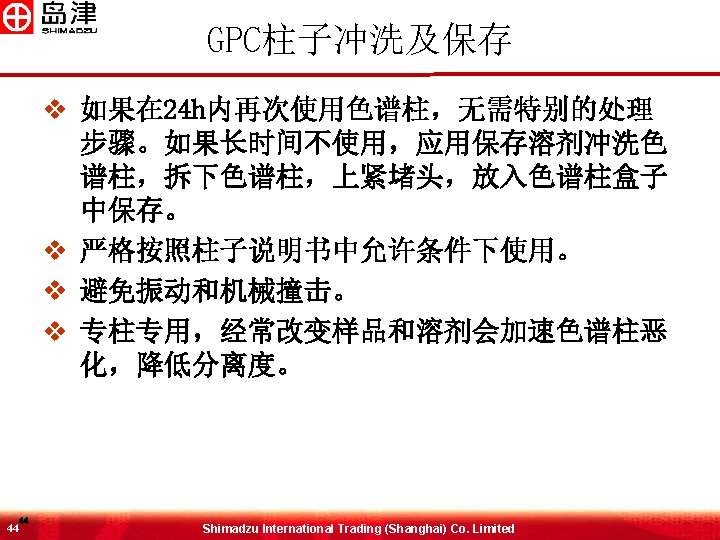 MW与RT之间的关系 Log (MW) 排阻极限 6 6 渗透极限 GPC柱 Shimadzu International Trading (Shanghai) Co. Limited