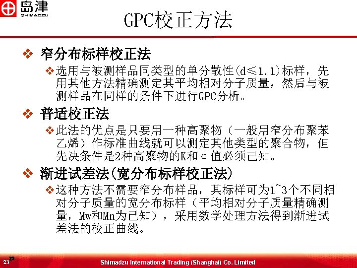 校正曲线 v 逐一注入聚合物标样以确定分子量与保留时间的关系 ID Time MW 1 14. 797 853000 2 15. 559 380000 3 16. 239 186000 4 16. 888 100000 5 17. 476 48000 6 18. 032 23700 7 18. 495 12200 8 19. 005 5800 常用线性拟合或者三次方拟合 22 22 Shimadzu International Trading (Shanghai) Co. Limited