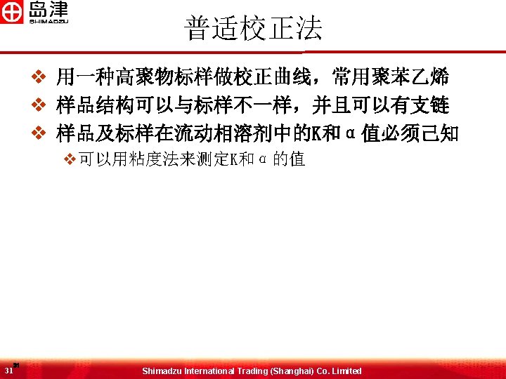 RQF的制约因素 v RQF 仅适用于单链聚合物 v 如果聚合物有支链结构, MW的计算就有误 30 30 Shimadzu International Trading (Shanghai) Co. Limited