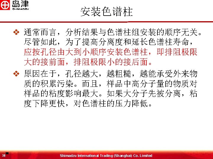 GPC色谱柱系列 v Shim-pack GPC-80 X for THF v Shim-pack GPC-80 XC for 氯仿 v Shim-pack GPC-80 XD for DMF v 排阻极限 (聚苯乙烯) v 1. 5 x 103(GPC-801), 5 x 103(GPC-802), 2 x 104(GPC 8025), 7 x 104(GPC-803), 4 x 105(GPC-804), 4 x 106(GPC -805), 4 x 107(GPC-806),4 x 107 (mixed gel,GPC 80 M), 2 x 108(GPC-807) 17 17 Shimadzu International Trading (Shanghai) Co. Limited