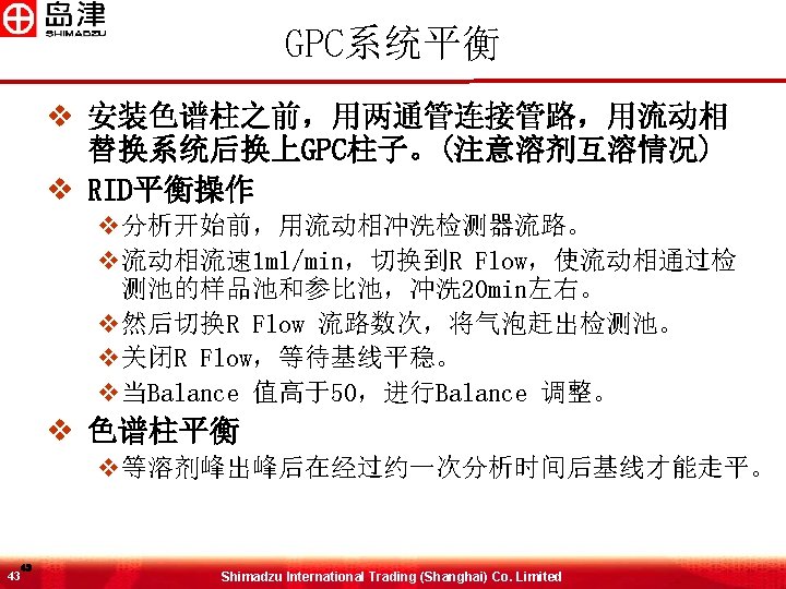 进样浓度范围及体积 v 分子量范围 样品浓度 v低于5, 000 <1. 0% v 5, 000~ 25, 000 <0. 5% v 25, 000~ 200, 000 <0. 25% v 200, 000~ 2, 000 <0. 1% v高于2, 000 <0. 05% v 进样体积 v 50 -100 u. L之间(浓度在 0. 05%-0. 5%之间) 42 42 Shimadzu International Trading (Shanghai) Co. Limited