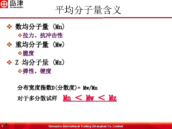 平均分子量计算公式 S Hi 数均分子量 Mn = S (Hi / Mi) 重均分子量 Mw = S Mi Hi S Hi Z均分子量 Mz = ΣMi 2 Hi S Mi Hi Z+1均分子量 Mz+1 = ΣMi 3 Hi S Mi 2 Hi Hi: 峰高 Mi:分子量 8 8 Shimadzu International Trading (Shanghai) Co. Limited