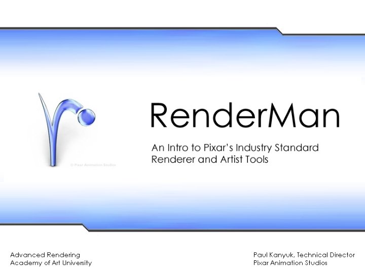 What is Render. Man ? Render. Man™ is a 3 D scene description language published and owned by PIXAR Animation Studios. It subdivides into two areas: The Ri API or RIB The Render. Man™ Shading Language (RSL). Render. Man is NOT a renderer, it is published standard for renderer’s to adhere to. (e. g. Pixie is a Render. Man renderer. )