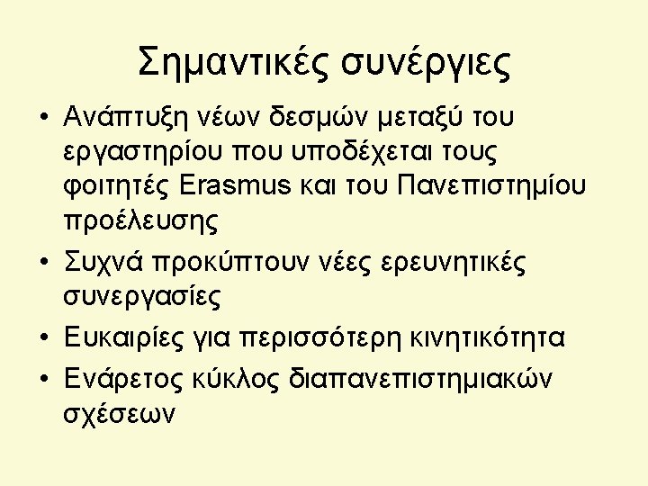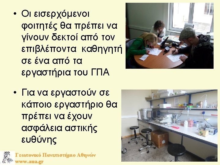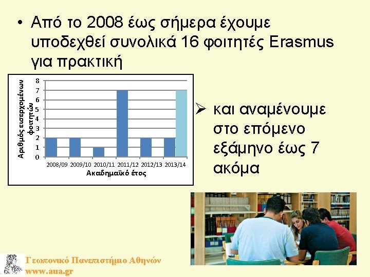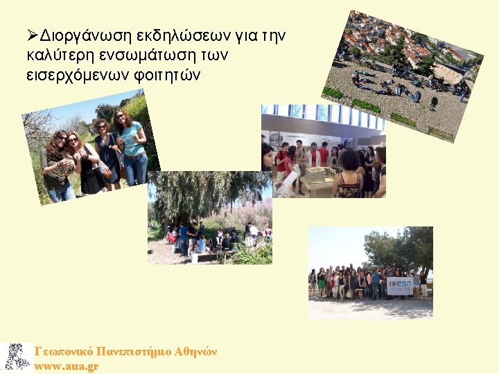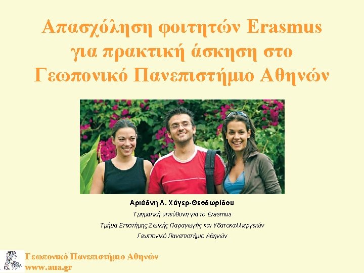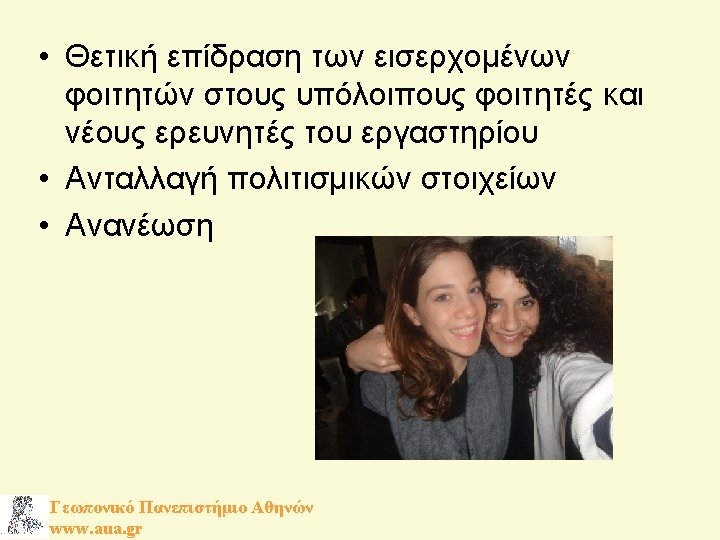 Οι εισερχόμενοι φοιτητές έγραψαν φεύγοντας… «My Erasmus experience at the Agricultural University of Athens has stretched my mind in new directions. I was pleasantly surprised by the academic level. » Filip K. (Czech Republic) «The Agricultural University of Athens offered me various types of courses, professors were very helpful and reliable and they impressed me with their way of thinking about life. » Deja M. (Slovenia) «Through Erasmus, I changed some ways of my thinking and I started feeling as a European citizen. Europe is not so huge anymore because I have colleagues in Spain, Italy, Germany, Finland …These countries are now very close to my Poland. » Mateusz C. (Poland) «My laboratory work has been very productive and I have got the most out of it!» Carmen Priscila C. R. (Spain) «I will advise people from my University to participate in the Erasmus programme, especially to go to a country which is different to ours, like Greece, so that they learn about a culture which is worth finding out about. » Ewelina R. (Poland) «Students and professors are friendly and more open to each other than in my country. The courses were interesting and I enjoyed learning here. » Magdalena B. (Germany) «The academic level in the Agricultural University of Athens is very good because lecturers seem to be experts in their field of knowledge. I am very happy I had the opportunity to see how organisation of studies works in another University. » Martyna S. (Poland)