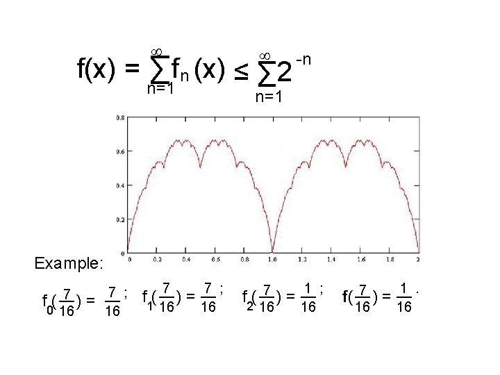 Section 2. Le Blancmange function Given x, 0 ≤ x ≤ 1, and non-negative integer n, let k be the greatest non-negative integer such that a = 2 -nk ≤ x and b(x, n) = 2 -n(k+1). Define (x, n) fn : [0, 1] by fn(x) = min{x-a k=0 , b - x}. (x, n)