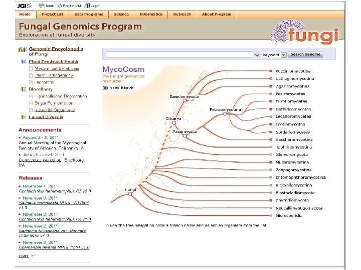 Fungal projects Over a million species in the Kingdom Fungi have evolved over millions of years to occupy diverse ecological niches and have accumulated an enormous but yet undiscovered natural arsenal of potentially useful innovations. While the number of fungal genome sequencing projects continues to increase, the phylogenetic breadth of current sequencing targets is extremely limited. Exploration of phylogenetic and ecological diversity of fungi by genome sequencing is therefore a potentially rich source of valuable metabolic pathways and enzyme activities that will remain undiscovered and unexploited until a systematic survey of phylogenetically diverse genome sequences is undertaken.