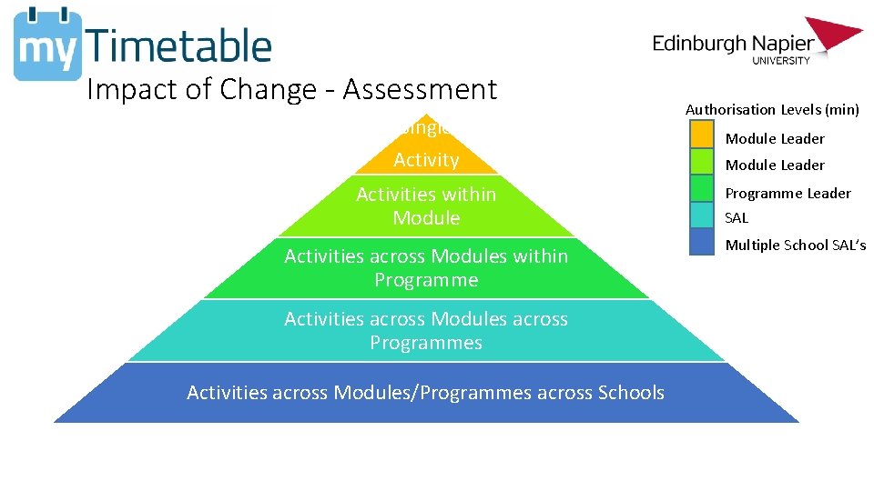 Impact of Change - Assessment Single Activity Activities within Module Activities across Modules within Programme Activities across Modules across Programmes Activities across Modules/Programmes across Schools Authorisation Levels (min) Module Leader Programme Leader SAL Multiple School SAL’s