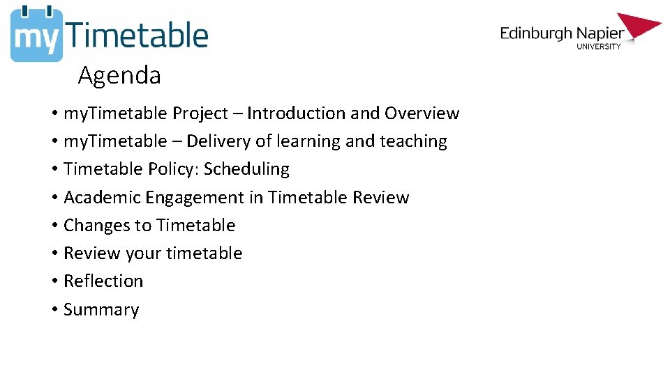 Agenda • my. Timetable Project – Introduction and Overview • my. Timetable – Delivery of learning and teaching • Timetable Policy: Scheduling • Academic Engagement in Timetable Review • Changes to Timetable • Review your timetable • Reflection • Summary