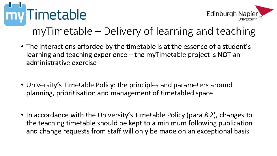 my. Timetable – Delivery of learning and teaching • The interactions afforded by the timetable is at the essence of a student’s learning and teaching experience – the my. Timetable project is NOT an administrative exercise • University’s Timetable Policy: the principles and parameters around planning, prioritisation and management of timetabled space • In accordance with the University’s Timetable Policy (para 8. 2), changes to the teaching timetable should be kept to a minimum following publication and change requests from staff will only be made on an exceptional basis