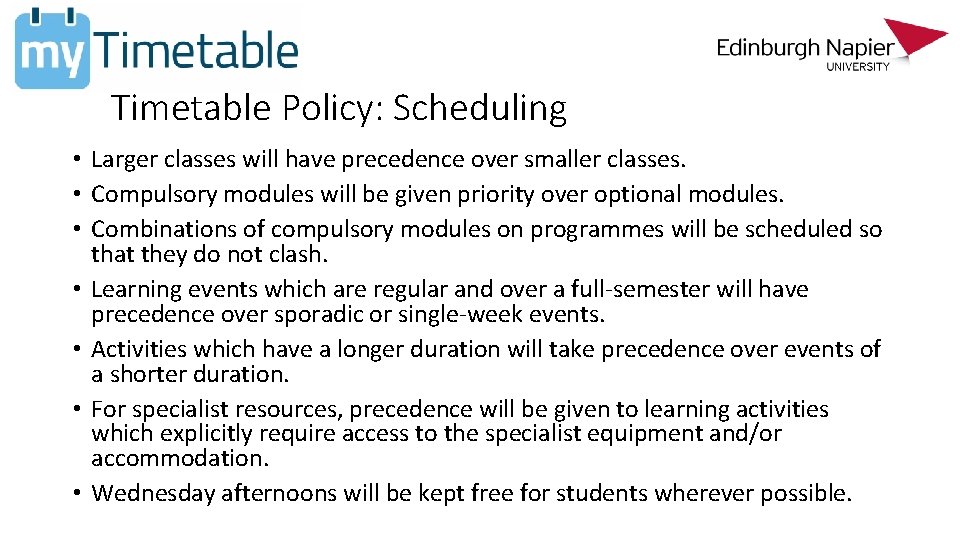 Timetable Policy: Scheduling • Larger classes will have precedence over smaller classes. • Compulsory modules will be given priority over optional modules. • Combinations of compulsory modules on programmes will be scheduled so that they do not clash. • Learning events which are regular and over a full-semester will have precedence over sporadic or single-week events. • Activities which have a longer duration will take precedence over events of a shorter duration. • For specialist resources, precedence will be given to learning activities which explicitly require access to the specialist equipment and/or accommodation. • Wednesday afternoons will be kept free for students wherever possible.