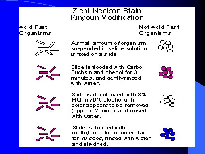 Characteristics of the Genus Mycobacteria Slim, rod shaped, non-motile, do not form spores. Ø Do not stain by Gram stain. Why ? Ø Cell wall contains high lipid concentration (Mycolic acid ) which resists staining by Gram stain. Ø Acid- Alcohol Fast Bacilli (AFB) : resist decolorization with up to 3% HCL, 5% ethanol or both. Ø