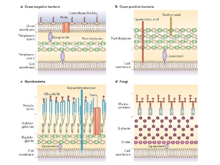Structure of Mycobacterium Cell Wall 1 -out lipid, 2 -mycolic acide, 3 -polysaccharide (arabinogalactan), 4 -peptidoglycan, 5 plasma membrane, 6 -lipoarabinomannan (LAM), 7 -fosfatidilinositol mannosid, 8 -cell wall