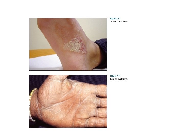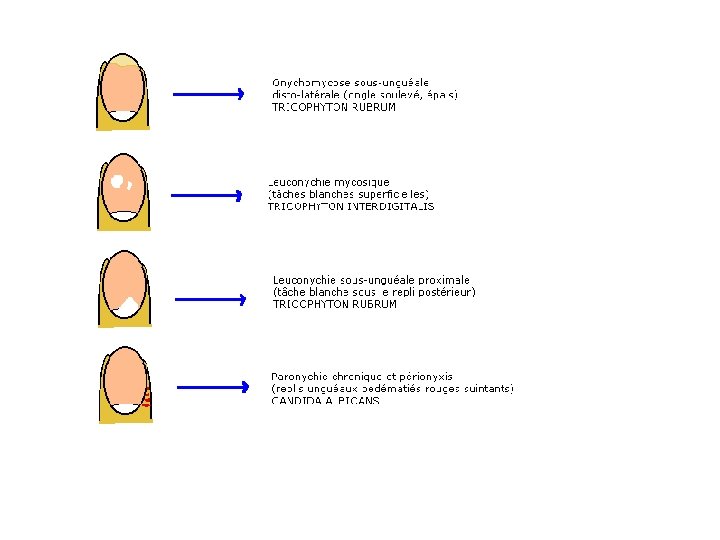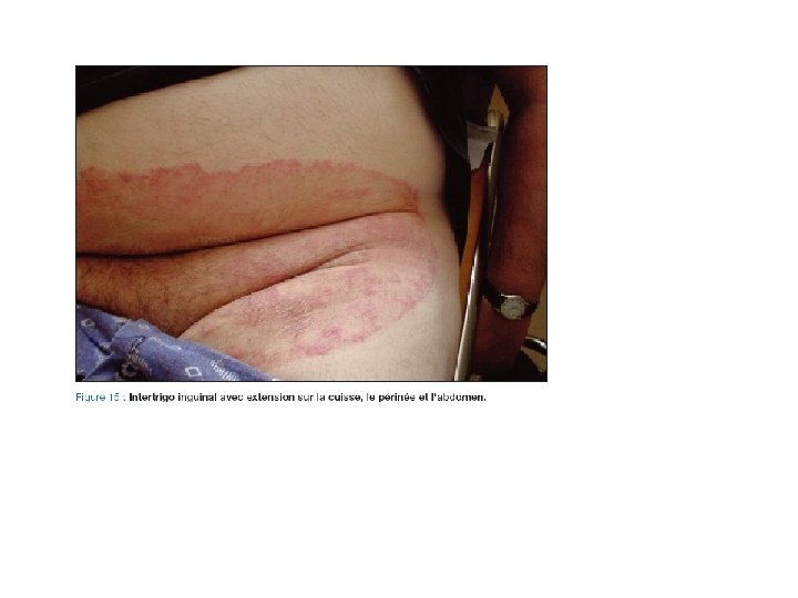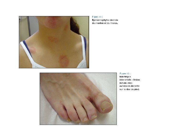 Clinique • Ongles (onyxis): – Pied+++ (T. interdigitale)- bord libre • Plis: – Herpes circiné: arrondi, tendance à la guérison centrale. • Petits plis- Intertrigo digito plantaire • Grands plis-Inguinal-Eczéma marginé de Hebra. • Plante des pieds, paume des mains.