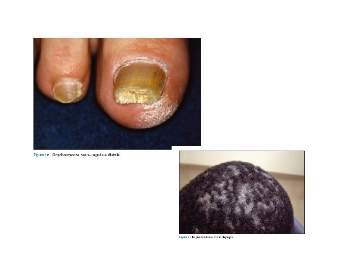 Clinique • Dermato+++ • Teignes+++ – Tondantes, plaques arrondies, cheveux cassés: • Anthropophiles (T. soudanense) • Zoophiles (M. canis) • Enfant milieu scolaire défavorisé.