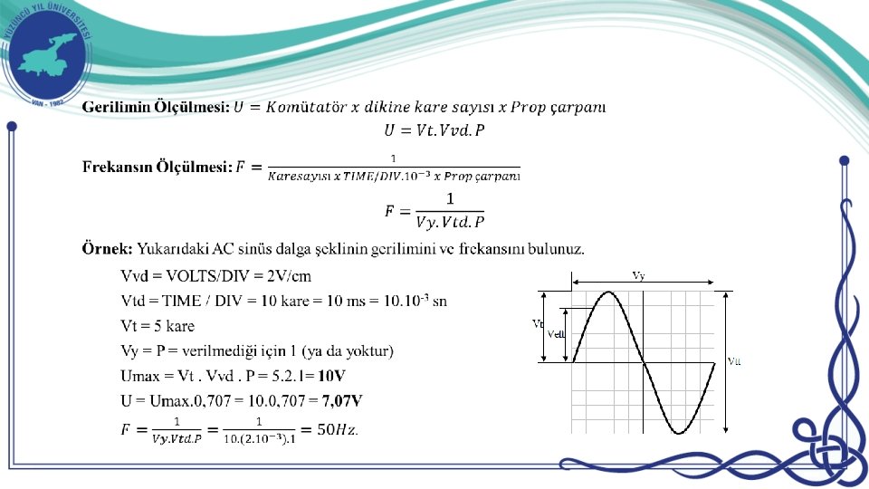 • • 30. 3. Osiloskop İle Alternatif ve Doğru Gerilimin Ölçülmesi Osiloskop ile sinyaller maksimum 400 V’a kadar ölçülebilir. Gerilim ölçülmeden önce kalibrasyon yapılmalı. Kalibrasyon için osiloskobun ön panelinde bulunan 2 voltluk kare sinyali kullanılır. Osiloskop ölçmelerindeki işaret büyüklükleri için maksimum gerilim (Vt) değeri kullanılır. Osiloskop ekranında görülen sinüzoidal bir dalga şeklinin efektif değerini bulmak için mevcut dalganın bulunan değeri 0, 707 ile çarpılması gerekir. Dikey kare sayısı, VOLT/DIV, Prop çarpılır.