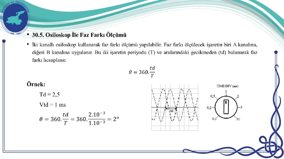 30. 4. Osiloskop İle Frekansın Ölçülmesi TIME/DIV. anahtarının üzerindeki zaman katsayısı ms/cm olarak belirtilmiştir, bu katsayı kullanıldığında 10 -3 ile çarpılarak sn birimine dönüştürülmesi gerekir. Yatay kare sayısı, TIME/DIV ve Prop çarpılır. • • Vt = Tepe değeri, dikey kare sayısı Vy = Yatay kare sayısı Veff = Efektif değer Vtt = Tepeden tepeye değeri Vvd = VOLT / DIV Vtd = TIME / DIV (milisaniye) P = Prop katsayısı