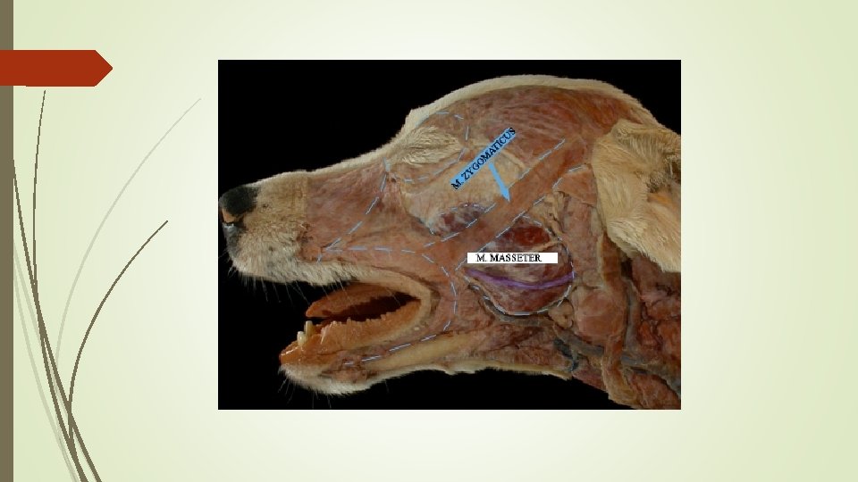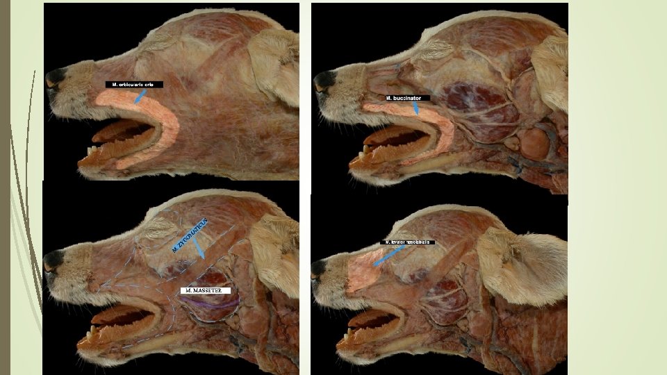 Köpekte baş kasları. Sığırda baş kasları. Atta baş kasları. 1 - M. Masseter 2 - M. orbicularis oculi 3 - M. Zygomaticus 4 - M. Lacrimalis 5 - M. levator labii maxillaris 6 - M. levator naso labialis 7 - M. Caninus 8 - M. Orbicularis Oris 9 - M. Buccinator 11 - M. zygomatico-auricularis 12 - M. temporo-auricularis 14 - Glandula parotis 15 - M. parotido-auricularis 17 - M. digastricus.