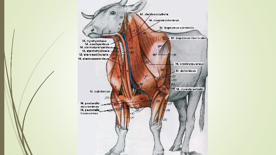 Mm. colli (boyun kasları) 15 M. brachiocephalicus 16 - M. cleidobrachialis 17 - M. cleidooccipitalis (Rum) 18 - M. cleidotransversarius (Eq) 19 - M. cleidocervicalis (Car) 20 - M. cleidomastoideus M. sternocephalicus 21 - M. sternomandibularis 22 - M. sternomastoideus (Rum) 23 - M. sternooccipitalis (Car) 24 - M. longus colli 25 - M. splanius Mm. hyoidei (dış dil kasları) 26 - M. sternohyoideus 27 - M. sternothyroideus 28 - M. omohyoideus