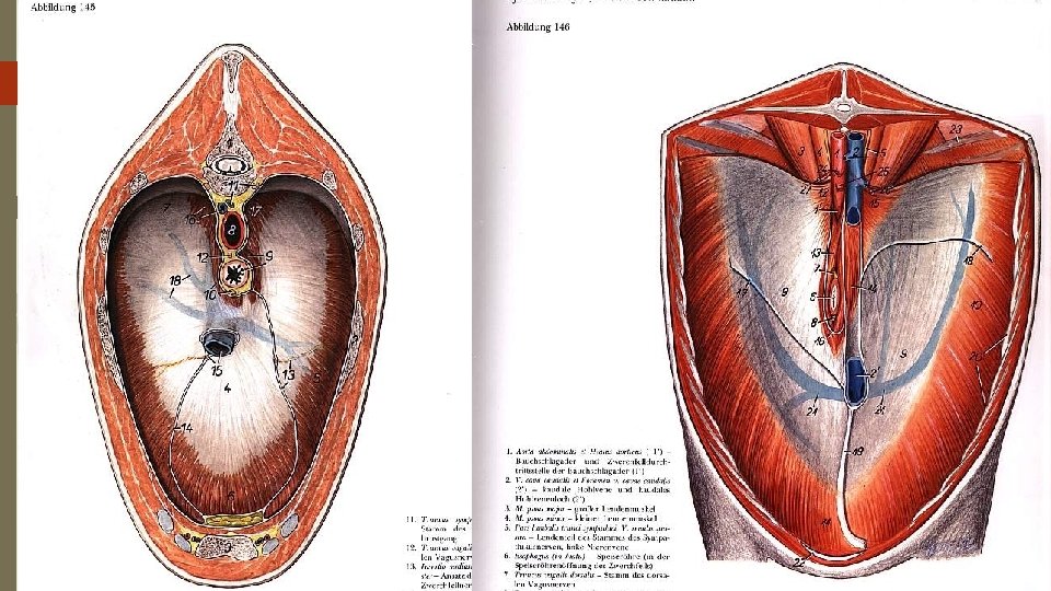 Mm. abdominis (karın kasları) 45 - M. obliquus externus abdominis 46 - M. obliquus internus abdominis 47 - M. transversus abdominis 48 - M. rectus abdominis 49 - M. quadratus lumborum 50 - Linea alba n Diaphragma 51 - Pars lumbalis 52 - Pars costalis 53 - Pars sternalis 54 - Hiatus aorticus 55 - Hiatus esophageus 56 - Foramen vena cavae