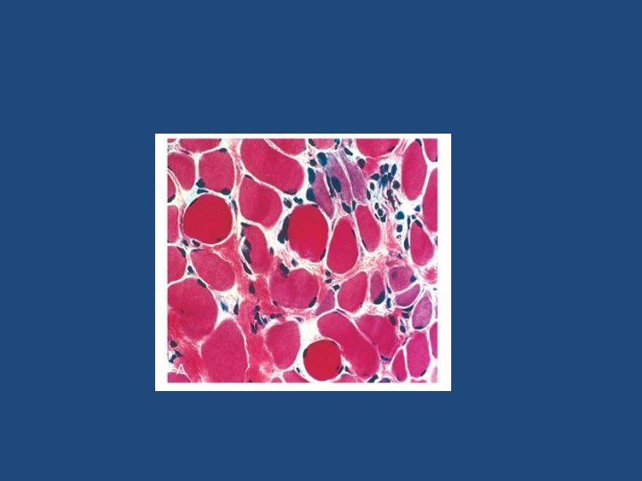 Inflammatory Myopathies • Histologically: – infiltration by lymphocytes – degenerating and regenerating muscle fibers • The pattern of muscle injury and the location of the inflammatory infiltrates are fairly distinctive for each subtype