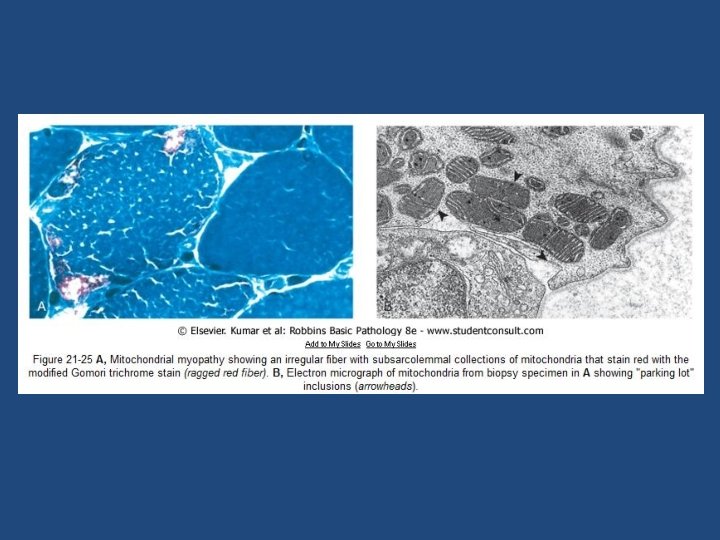 Mitochondrial myopathies – There can be neurologic symptoms, lactic acidosis, and cardiomyopathy – The most consistent pathologic findings in skeletal muscle are irregular muscle fibers and aggregates of abnormal mitochondria; the latter impart a blotchy red appearance to the muscle fiber on the modified Gomori trichrome stain, hence the term ragged red fibers – The electron microscopic appearance is also often distinctive: there are increased numbers of, and abnormalities in, the shape and size of mitochondria, some of which contain paracrystalline parking lot inclusions or alterations in the structure of cristae