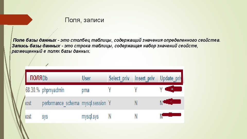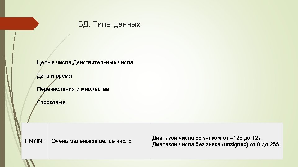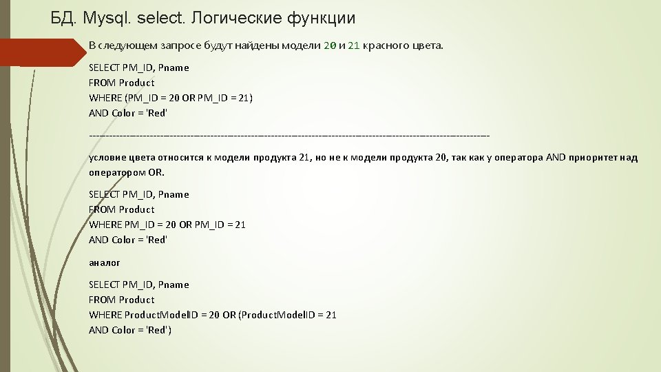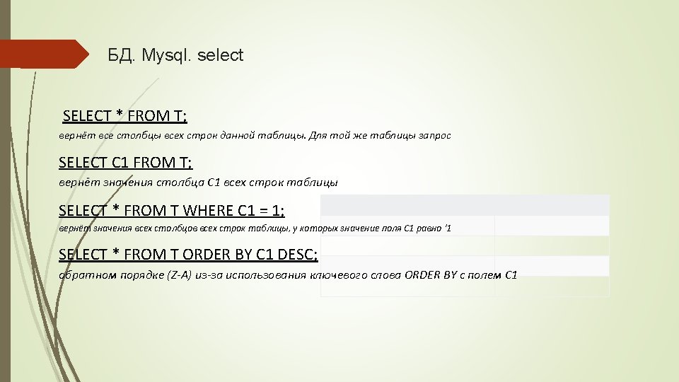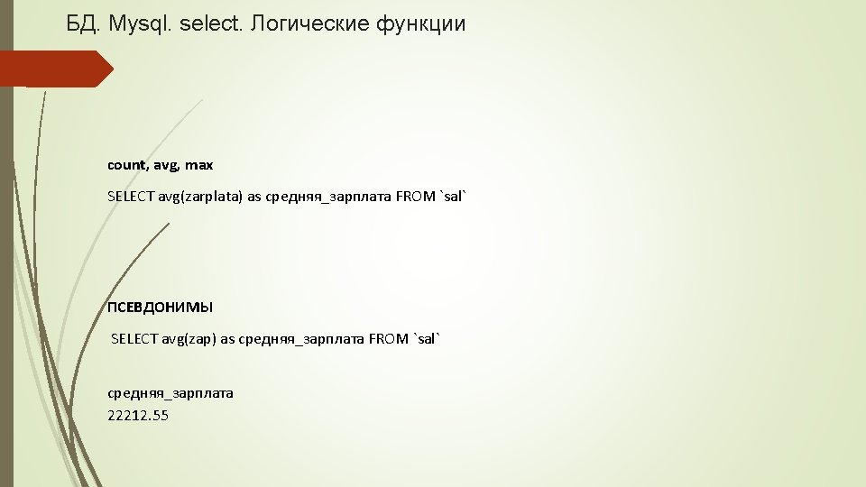 БД. Mysql. select Знаки =, !=, >, , < SELECT salary FROM `staff` where salary!=60000 DISTINCT select DISTINCT age from employee_data ORDER BY age; Функция LIKE SELECT * FROM table WHERE column LIKE '%инфо%' SELECT * FROM testtable WHERE name NOT LIKE '%kk%';