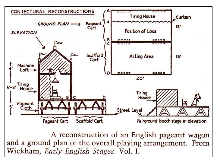 Pageant Wagons as Stages Processional Staging Used in England Spain Find a place on the parade route to watch the plays in sequence. Wagons would stop from time to perform the play. You could pay for the best seats, or places inside of homes lining the street. The term "pageant" is used to refer to the stage, the play itself, and the spectacle. Platform on wheels Pulled by men Small enough to fit down narrow streets May have had second platform, pulled behind