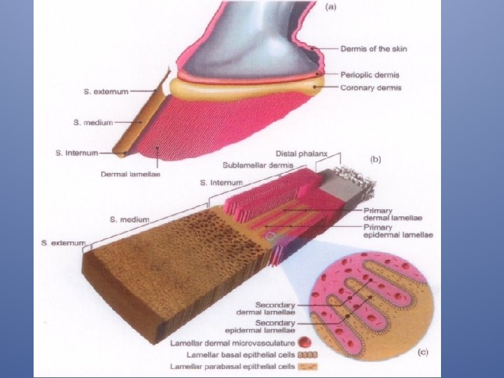 Endocrinological laminitis-includes EMS and ECD and direct injection of corticosteroids Inflammation of (the lamellae)? Not usually present. Massive separation from the basement membrane may not be present. Not a feature of EMS laminitis? A slow insidious stretching and lengthening of SEL and eventually PEL. Often No pain showing. Primary lamellae and the secondary lamellae most affected. Lamellar basal epithelial cells Parabasal cells Basement membrane Dermal lamellae gradually affected.