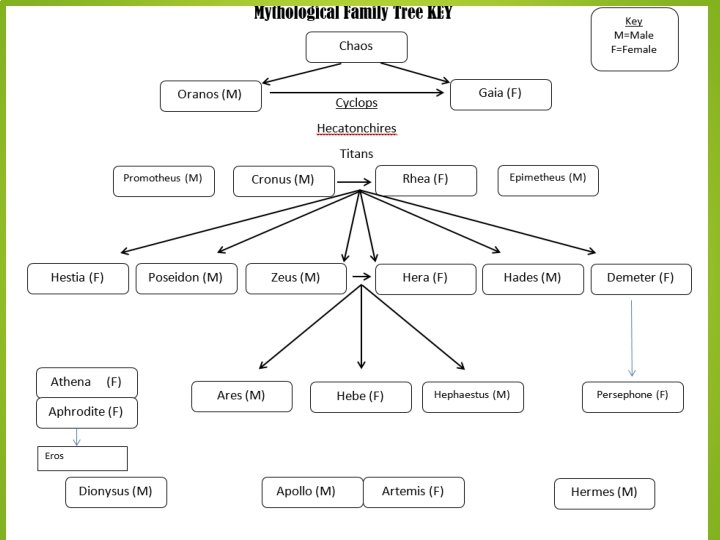 As I Present: • Record the name of each God/Goddess in the blank family tree provided • Please include an “M” beside the name if the individual is male • Please include an “F” beside the name if the individual is female • Beside/under each name jot down a brief description of the God/Goddess. (BE BRIEFWe will explore them in detail later on in the quarter)