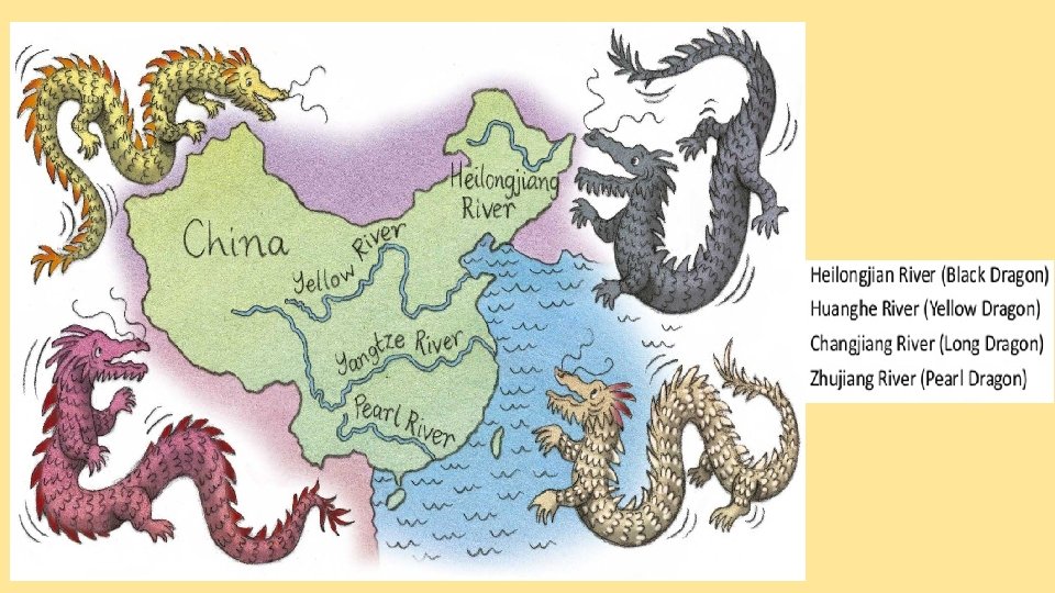 China's four great rivers are named after the Four Dragons - In the far north, the Huanghe (Yellow River). The Heilongjian (Black Dragon) in central China. The Yangtze (Changjiang, or Long River) farther south. The Zhujiang (Pearl) in the very far south
