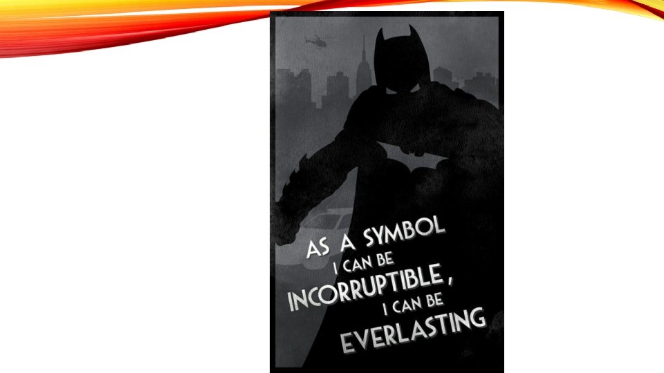 Myths: Symbolism The Power of a Symbol “People need dramatic examples to shake them out of apathy and I can’t do that as Bruce Wayne. As a man, I’m flesh and blood—I can be ignored; I can be destroyed—but as a symbol? As a symbol I can be incorruptible. I can be everlasting. ” “What symbol? ” “Something. . . elemental; something terrifying. ”