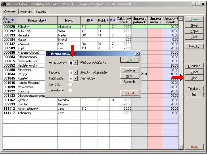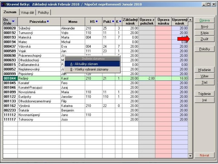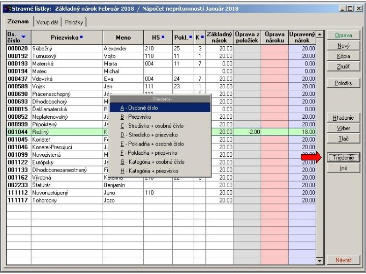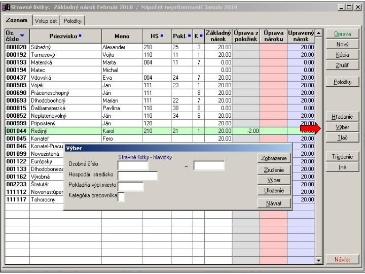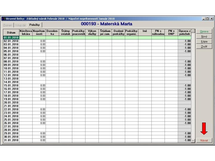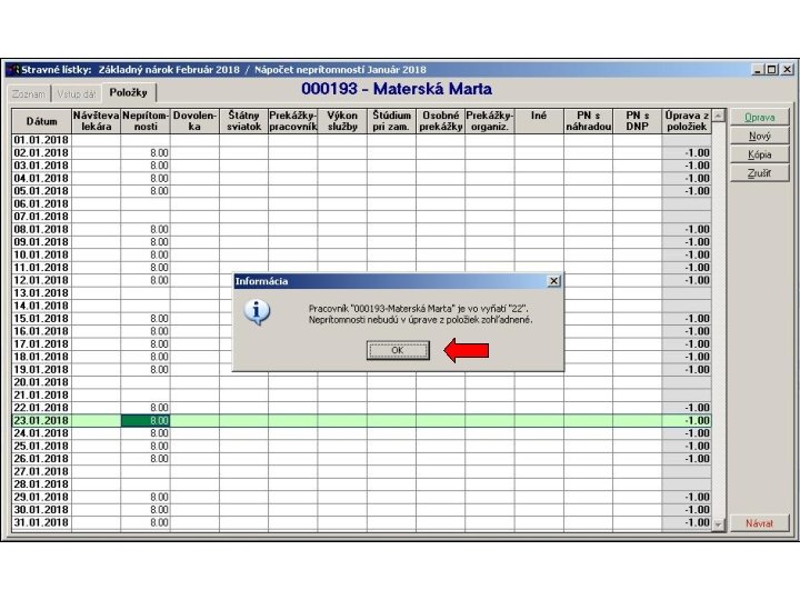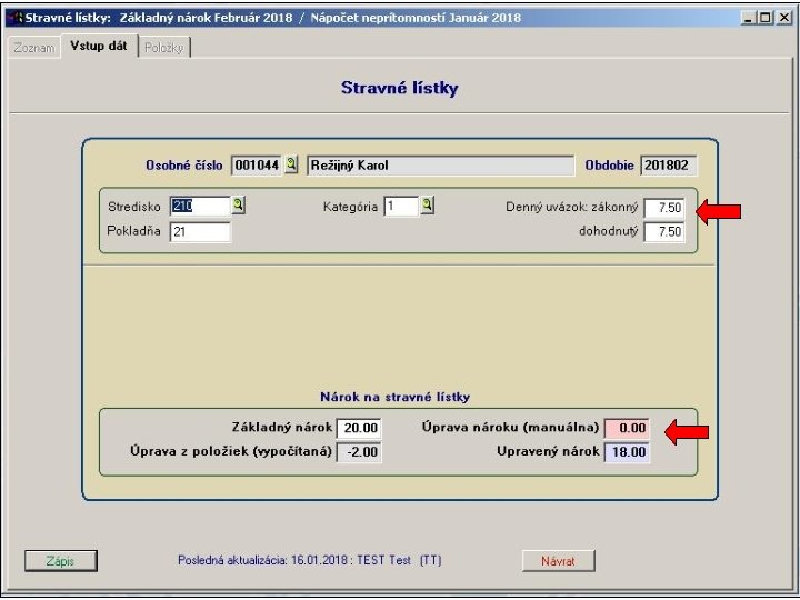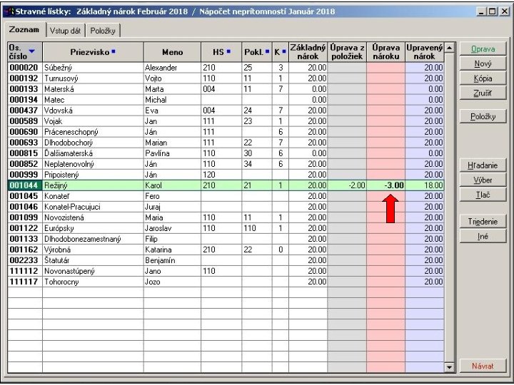 1. V položkovej časti vstupného formulára sú napočítané za jednotlivé pracovné dni hodiny neprítomností v členení podľa skupín mzdových zložiek definovaných v parametroch spracovania stravných lístkov. 2. Následne sa hodiny neprítomností za každý deň samostatne spočítajú a aktivuje sa výpočet krátenia nároku na stravné lístky