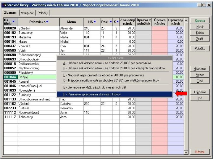 Základný nárok na stravné lístky, úprava nároku na základe neprítomnosti (zo súbor položiek), úprava nároku (manuálna) a upravený nárok