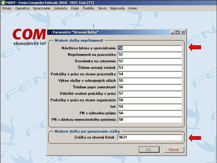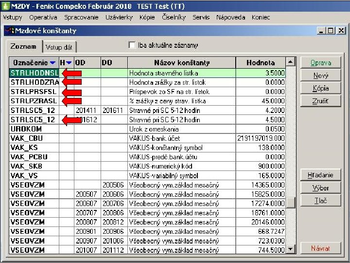 Pre výpočet zrážky za stravné lístky sú doplnené mzdové konštanty: STRLSC 5_12 - Stravné pri SC 5 -12 hodín STRLHODNSL - Hodnota stravného listka STRLPZRASL - % zrážky z ceny strav. lístka STRLPRSFSL - Príspevok zo SF na str. lístok STRLHODZRA - Hodnota zrážky za str. listok Hodnota zrážky za stravný listok sa vypočíta podľa vzorza: MIN(STRLSC 5_12, STRLHODNSL)*STRLPZRASL/100 -STRLPRSFSL. V prípade, ak je uvedená hodnota konštanty "STRLHODZRA - Hodnota zrážky za str. listok ", namiesto výpočtu zrážky za stravné lístky podľa vzorca sa použije priamo jej hodnota.