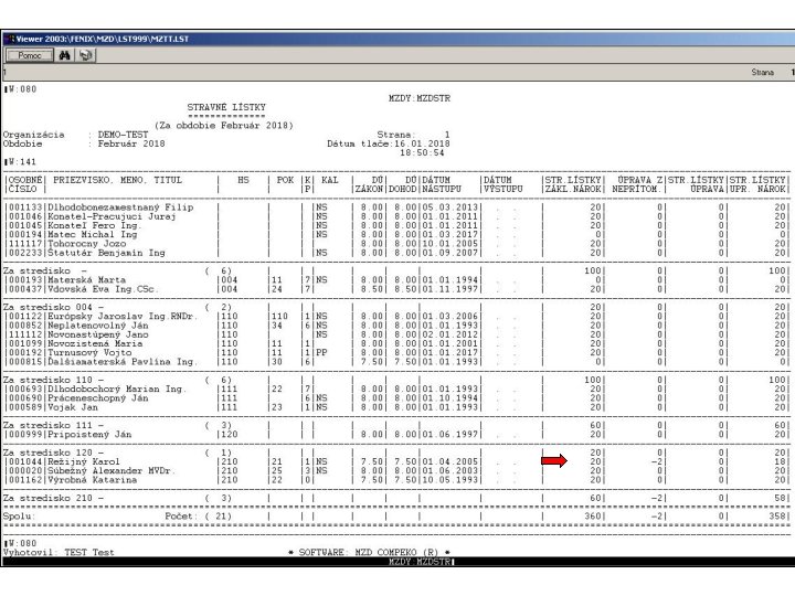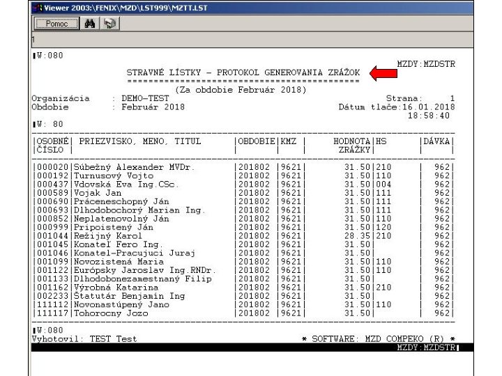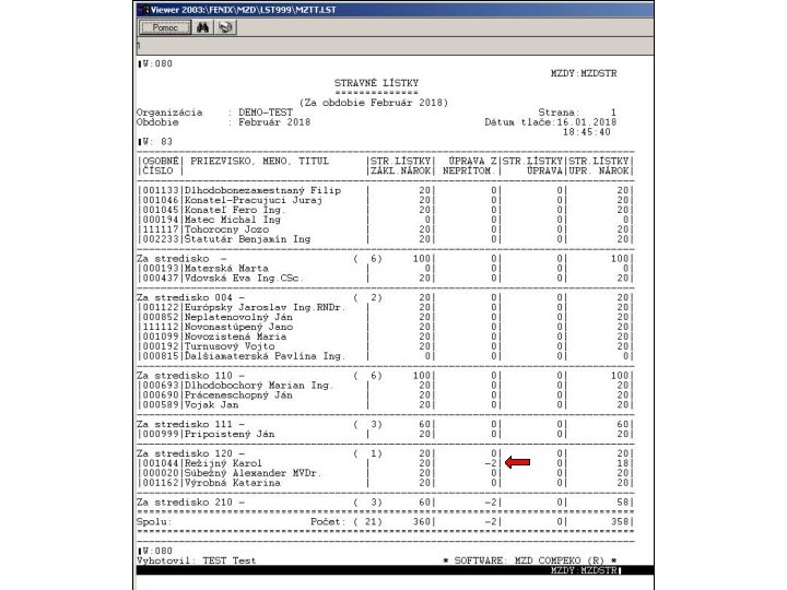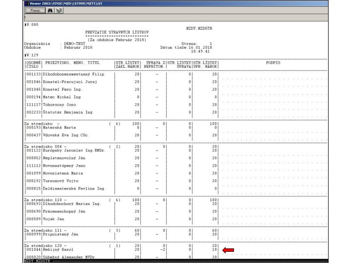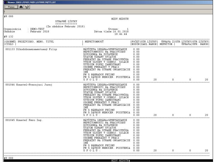 V programe je prepracovaná práca s evidencoiu stravných lístkov. Z hľadiska dátových štruktúr je spracovanie stravných lístkov rozložené do súborov MZSTRLH. dbf a MZSTRLP. dbf, kde MZSTRLH. dbf predstavuje hlavičky a MZSTRLP. dbf položky údajov spracovania. Hlavičková časť obsahuje okrem identifikačných údajov pracovníka hodnoty pre základný nárok na stravné lístky, hodnotu krátenia nároku z položiek, hodnotu užívateľsky zadanej korekcie a celkový upravený nárok na stravné lístky. V položkovej časti sú jednotlivé neprítomnosti pre každý kalendárny deň napočítavané po hodinách. Za každý deň samostatne sa v súbore položiek na základe súčtu hodín neprítomností v danom dni spočíta krátenie základného nároku na stravný lístok, ktoré sa prenáša do súboru hlavičiek.
