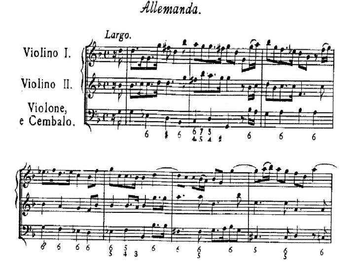 La sonata da camera �La Sonata da camera, invece, è in un numero variabile di movimenti, e questi movimenti ricalcano, assai liberamente, la struttura della Suite. � Allemanda– Corrente – Largo - Giga oppure: �Allemanda – Gavotta – Largo - Giga �o altri schemi possibili