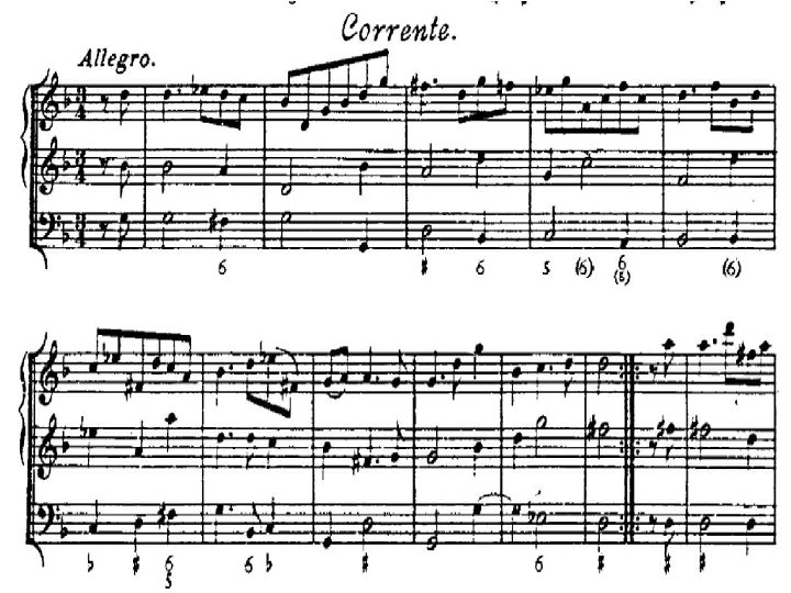 Courante o Corrente �Danza di origine italiana, in voga nei secoli XVI e XVII. �Di carattere vivace, dapprima era in tempo binario, poi ternario, ed entrò a far parte della suite e della partita strumentale. �Si distinsero un tipo di corrente francese, più moderata nell’andamento, e una italiana, di carattere più rapido ed impetuoso.