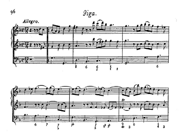 Giga �GIGA o JIG Danza in tempo ternario e di andamento veloce, in uso nei secoli XVII e XVIII. �Di origine forse irlandese (celtica), ebbe larga diffusione in tutta Europa, entrando a far parte della suite strumentale, di cui costituiva il tempo mosso finale. �Dal tempo originale di 3/8 veloce derivarono in seguito le gighe nei tempi composti di 6/8 e 12/8, i cui peraltro rimase caratteristica la suddivisione ternario del tempo. �Una danza popolare denominata giga - e che non ha nulla a che fare con la forma colta - era diffusa nell’Appennino settentrionale, e sopravvive sporadicamente nell’Appennino pavese e bolognese