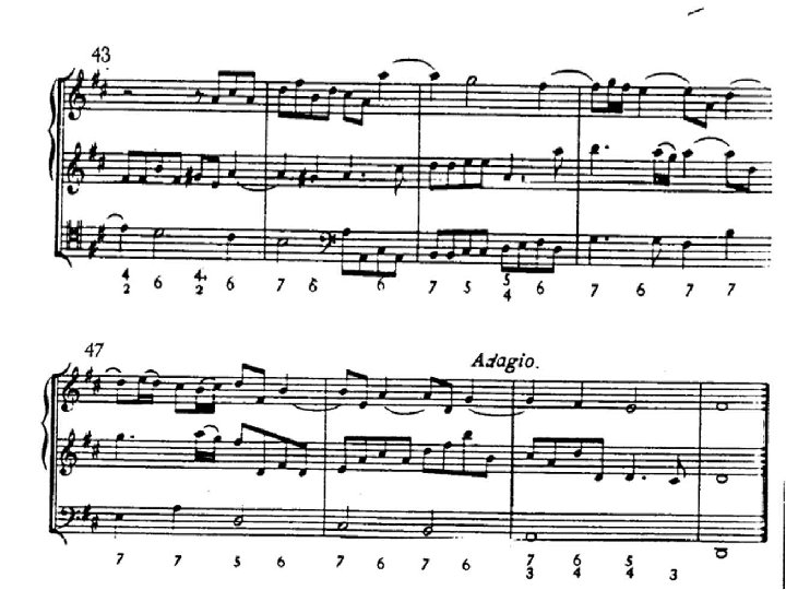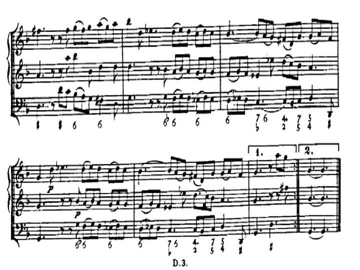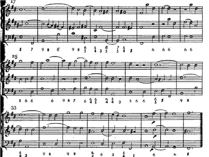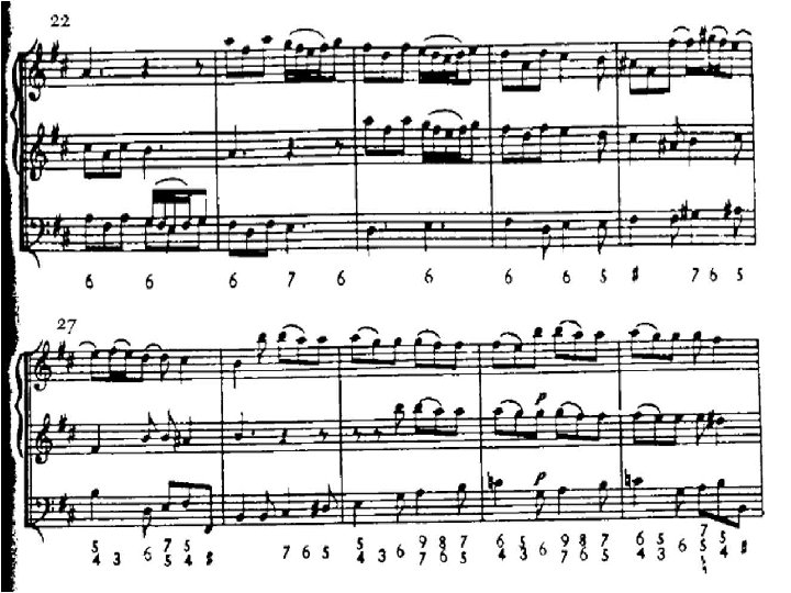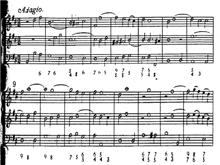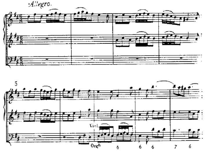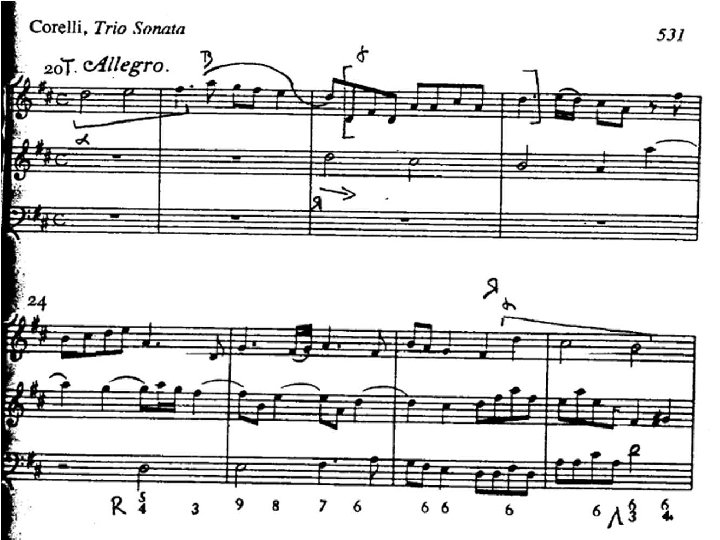 La sonata a tre �Nel corso del Seicento prende particolarmente piede la Sonata a tre, così chiamata in quanto scritta su tre pentagrammi: due per le parti acute, uno per il basso continuo. �Di solito queste Sonate erano destinate a due violini e a una viola da gamba, che poteva essere raddoppiata o sostituita da uno o più strumenti per il basso continuo (arciliuto, cembalo ecc). �Sappiamo tuttavia che non solo i tre archi potevano essere sostituiti da flauti, cornetti, oboi e fagotti ma che le singole parti potevano essere raddoppiate fino a prevedere una destinazione per piccola orchestra di questi brani.