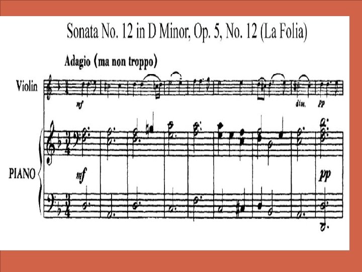 La folia �Nell’Opera V vengono radunate sonate da chiesa e sonate da camera, ma l’ultima è una melodia (La folia, danza di origine spagnola) con 23 variazioni �Variazioni nelle quali affronta con notevole gradualità le difficoltà tecniche del violino �I staccato �II passaggio da quartine a terzine �III uso dei bicordi �Messa sonora nei cantabili �Salti di corda nella coda